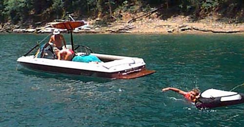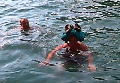 Above, Chris Benz, my nephew, swims to the tube to get ready to be pulled around the lake. Below, Bobby Parks laughs at Bryan Allen, who's trying to swim from his boat to the pontoon without getting his shoes and clothes wet. Miraculously, he made it and is now applying for a job carrying water in a jug on top of his head in a primitive village.