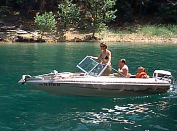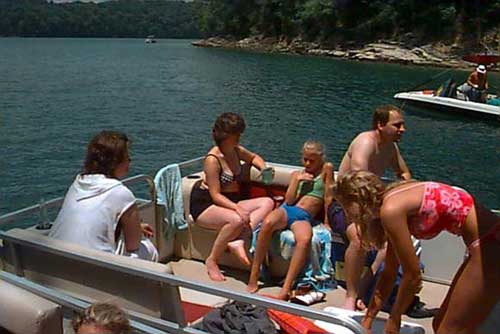 No, it's not the cast of Gilligan's Island pausing between scenes. It's the pontoon people, starring Herb "Ahoy Matey" Himes. Below, Nikki moves to the front of Garrett's boat to do her Titanic impression while Herb and his daughter, Katarina, brace for liftoff.