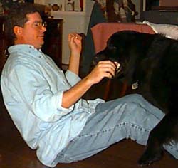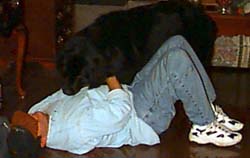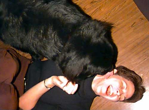 Of course, Thanksgiving in the Edge house includes all the traditional activities, like bear wrestling. In lieu of a bear, we substituted Xena. First, Kathleen felt the wrath of Xena and was lashed by the mighty canine's sandpaper tongue. Then Tony stepped into the field of battle and became dog fodder ...
