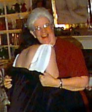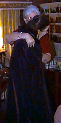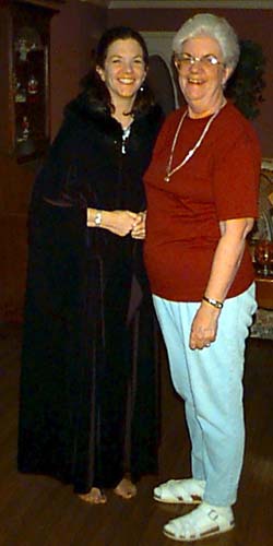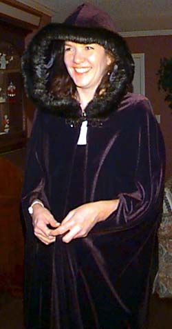 And then there's the annual Thanksgiving fashion show. The highlight this year was when mom gave Barb a cape to match the stunning new dress she was modeling. The top two photos show Barb's surprise at receiving the cape. At right, Barb shows that the back of the dress is just as stunning as the front, and below, Barb puts the dress/cape combo through its paces.