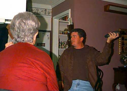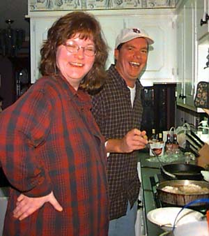 Above, Tony discovers that he can operate the satellite TV feed in the kitchen by carefully pointing the remote toward the back bedroom, where the receiver is located. At left, Tony and Lara fry chicken during pre-Thanksgiving festivities.